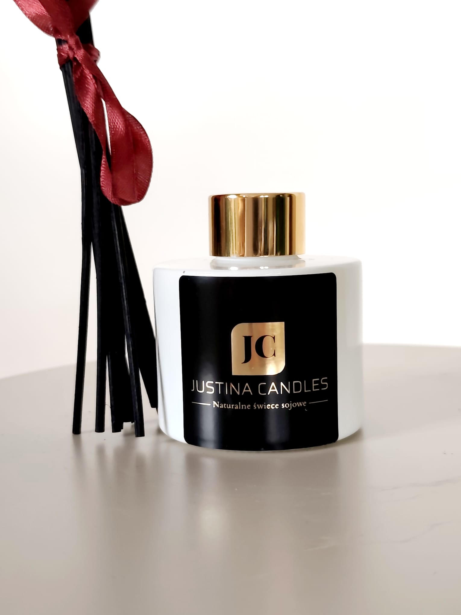 Dyfuzor zapachowy na bazie gliceryny wegańskiej w białym szkle w połysku, 10 patyczków rattanowych, 100ml