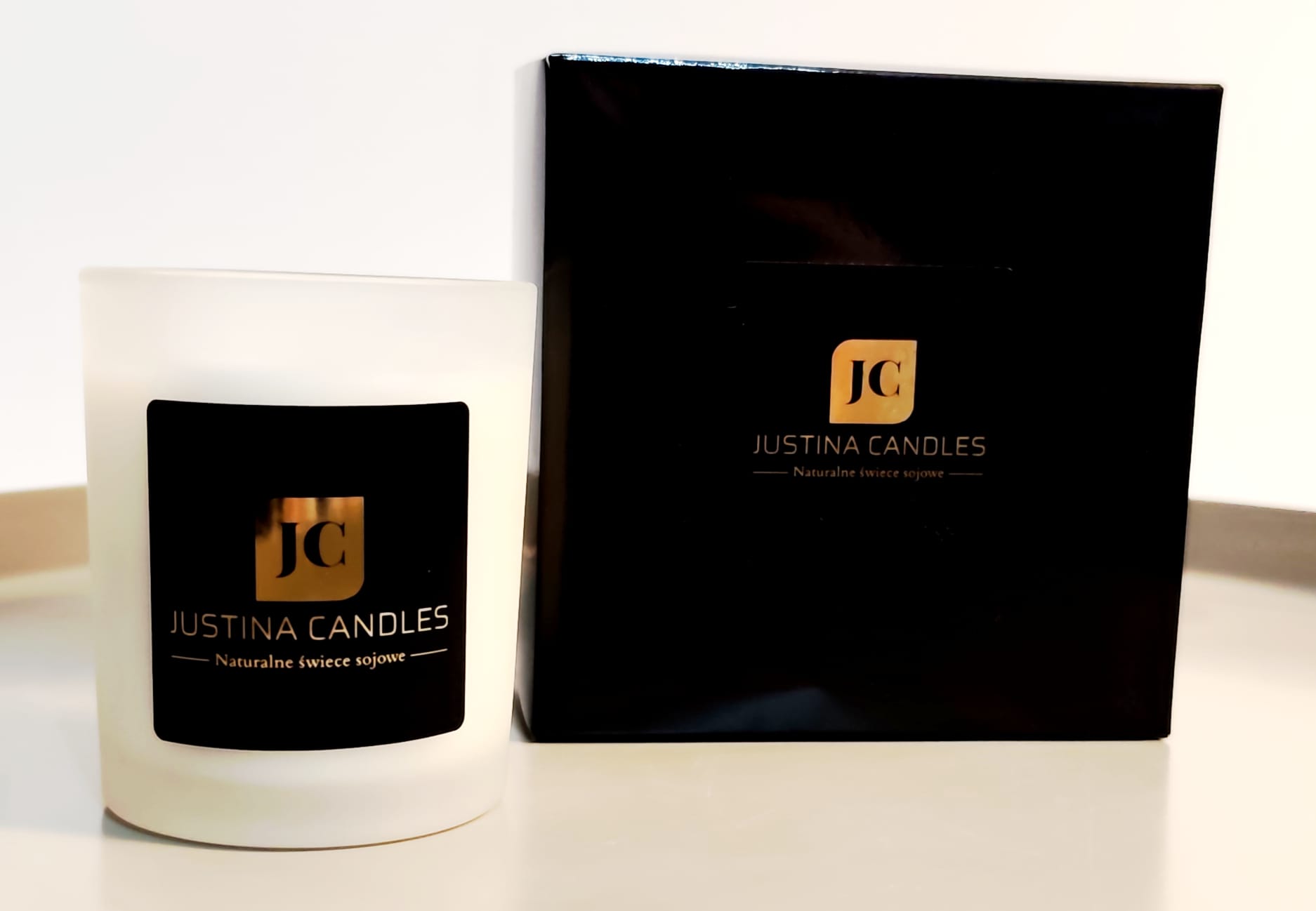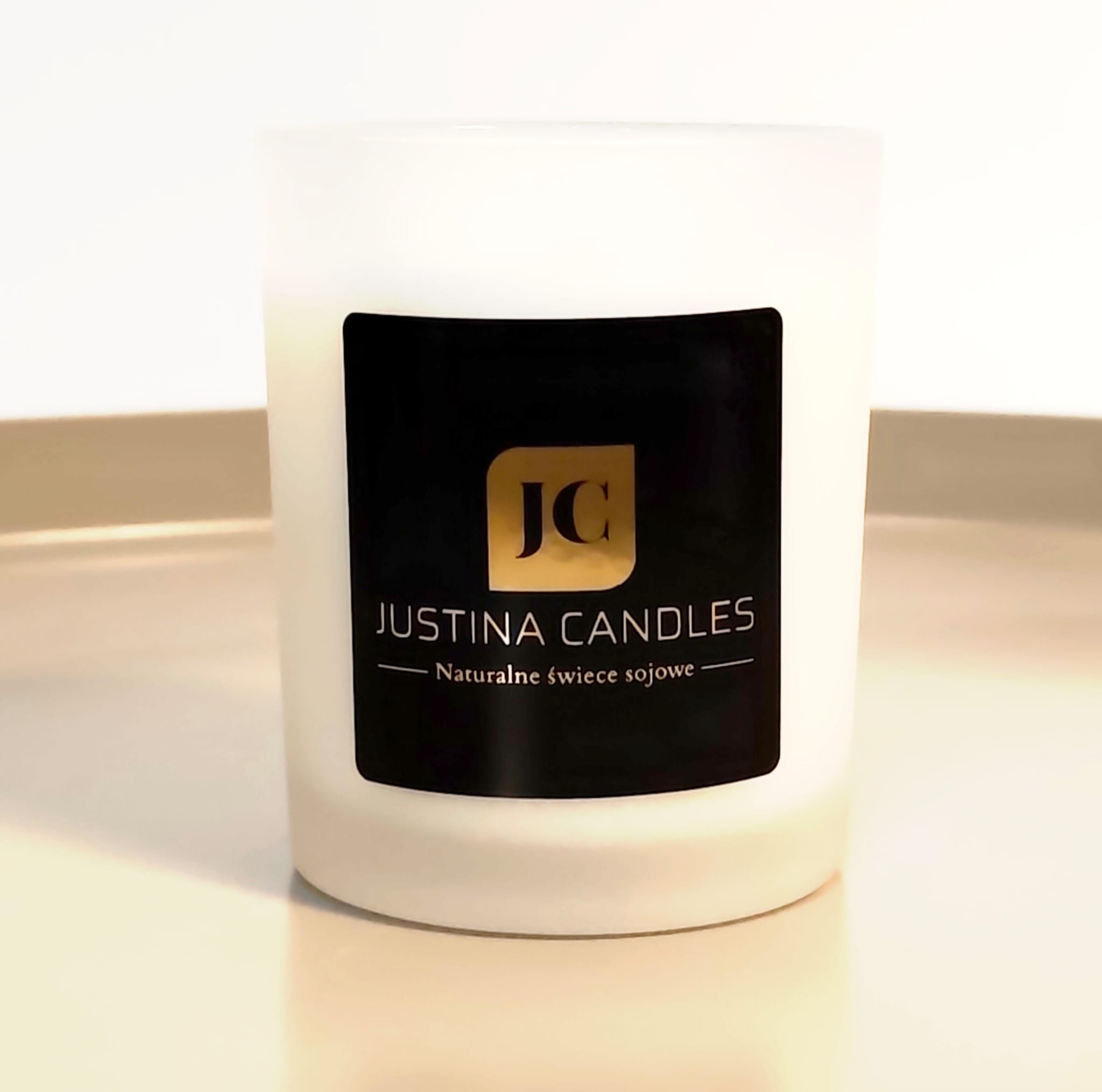 Świeca 180ml z najwyższej jakości wosku sojowego, w białym szkle w połysku z złotą pokrywką.